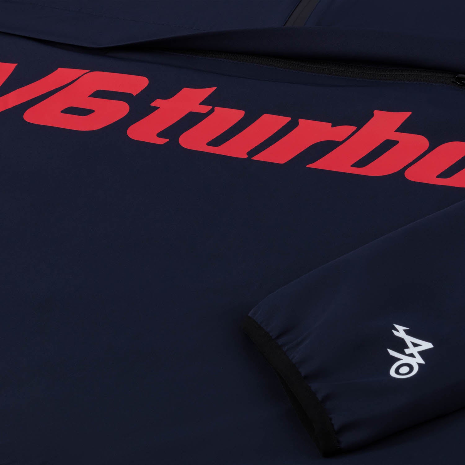 Coupe-vent imperméable et respirant ; 100 % polyester ; capuche sous col avec bloqueurs ; col montant avec fermeture étanche ; poignets et bas élastiqués ; sérigraphie V6 Turbo rouge poitrine et 70 ans sur manche ; couleur : bleu foncé.